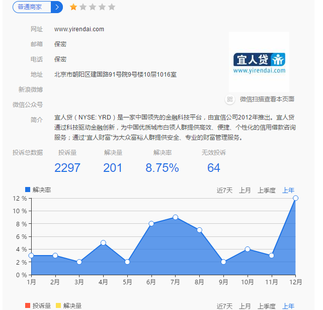 通过查询聚投诉平台,关于宜信、宜人贷的投诉量2297,解决率8.75% ,主要集中在阴阳合同、高额利息,砍头息,收取平台信息费,暴力催收,骚扰恐吓等 。