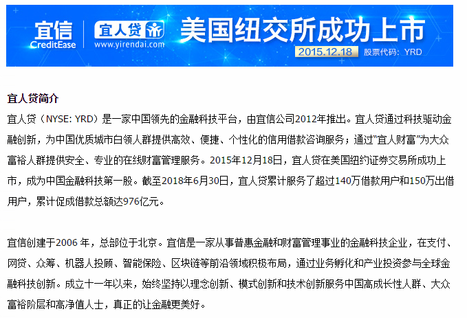 宜人贷作为宜信的网络平台,于2015年在美国纽交所上市,截至2018年6月30日,宜人贷累计服务了超过140万借款用户和150万出借用户,累计促成借款总额达976亿元。