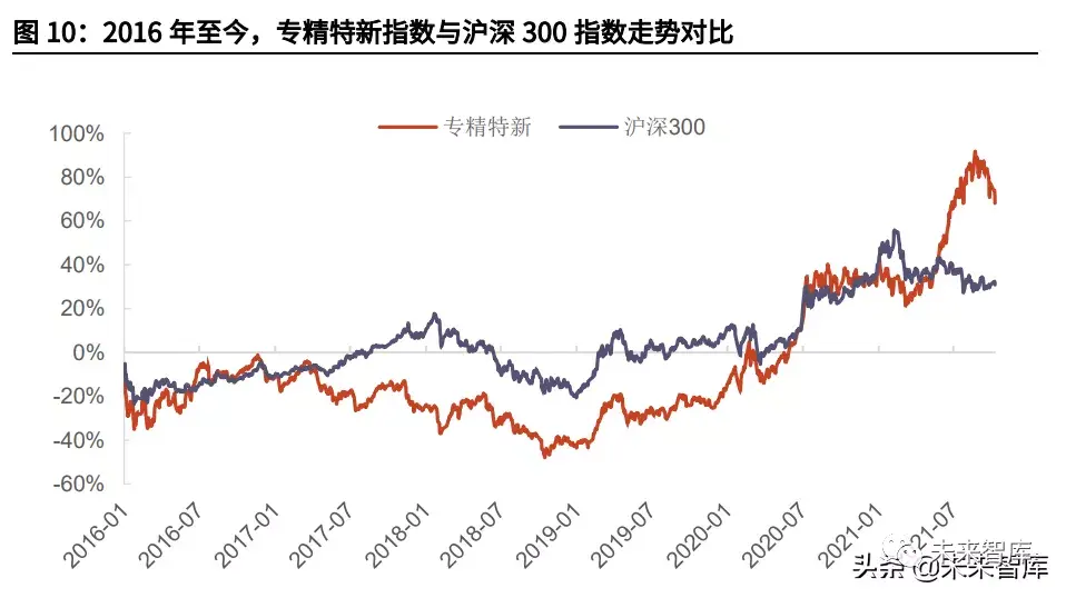 整体上看,2016 年至今,专精特新公司整体跑赢同期沪深 300 指数,特别 地,2019 年至今,专精特新公司相较于沪深 300 的超额收益越发明显。以前文 筛选出的 302 家专精特新上市公司为样本,采用流通市值加权的方式构建专精 特新指数,统计结果表明,2016 年以来,专精特新指数上涨 68.1%,优于同期 沪深 300 指数涨幅(+30.9%)。分区间来看,2016-2017 年,A 股市场风格偏 向于白马蓝筹股,以中小市值股票为主的专精特新指数表现明显弱于同期沪深 300 指数;2018 年,在 A 股单边下跌行情中,专精特新指数与沪深 300 指数跌 幅较为接近;2019 年至今,中美博弈背景下,国内对于制造业及专精特新企业的支持政策频出,专精特新指数也明显跑赢了同期沪深 300 指数,2019 年至今, 专精特新指数上涨 202.6%,而同期沪深 300 指数仅仅上涨 64.0%。