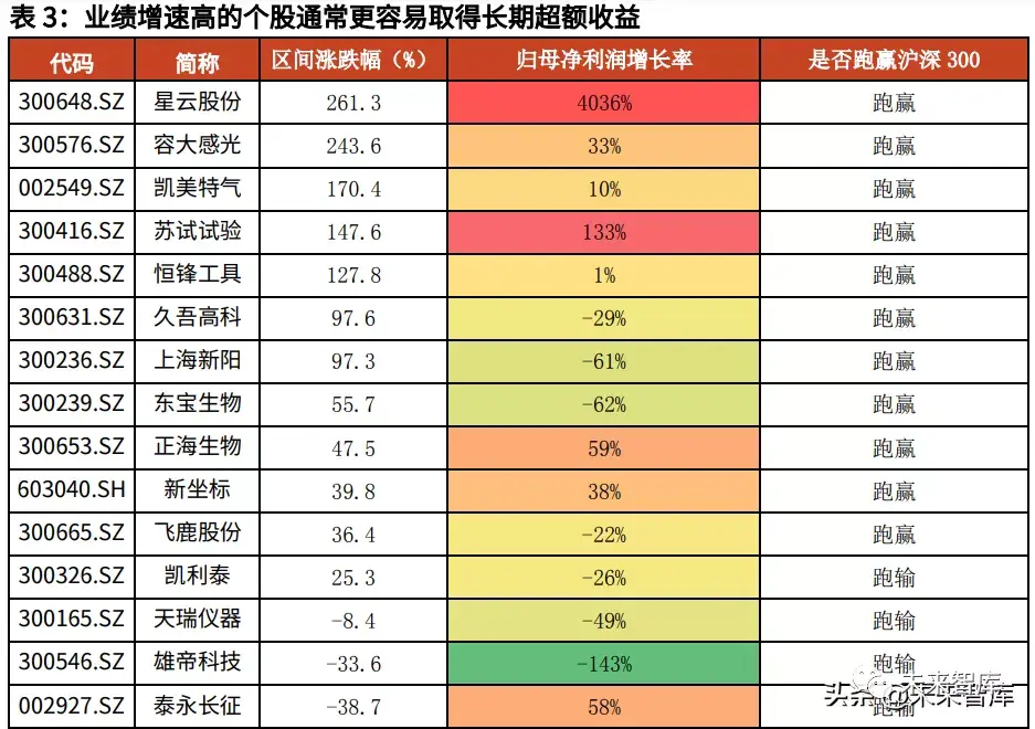 微观层面来看,业绩增速高的个股通常更容易取得长期超额收益。