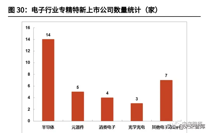 电子行业的专精特新上市公司一共有 33 家,根据中信二级行业分布在五个 子行业,分别为半导体行业 14 家,元器件行业 5 家,消费电子行业 4 家,光学 光电行业 3 家,其他电子零组件 7 家,半导体行业公司占比最大达 42.4%。