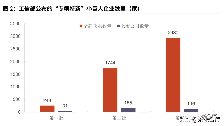 工信部分 别于 2019 年 6 月、2020 年 11 月及 2021 年 7 月公布了三批“专精特新”小巨 人名单。三批名单中共有 4922 家企业,其中,A 股上市公司有 302 家。