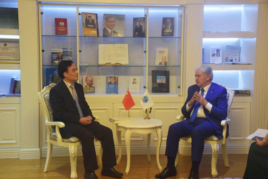 2018年6月,中国外文局副局长陆彩荣与时任上合组织秘书长阿利莫夫商议“丝路百城传”合作事宜。
