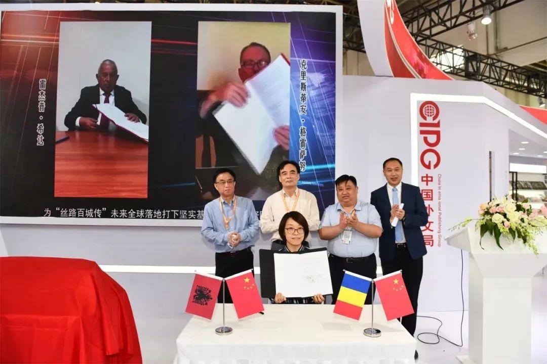 2021年9月14日,在第28届北京国际图书博览会上,外文出版社与罗马尼亚出版集团、阿尔巴尼亚凡·诺利出版社举行“丝路百城传”丛书多语种国际合作出版备忘录云签约仪式。