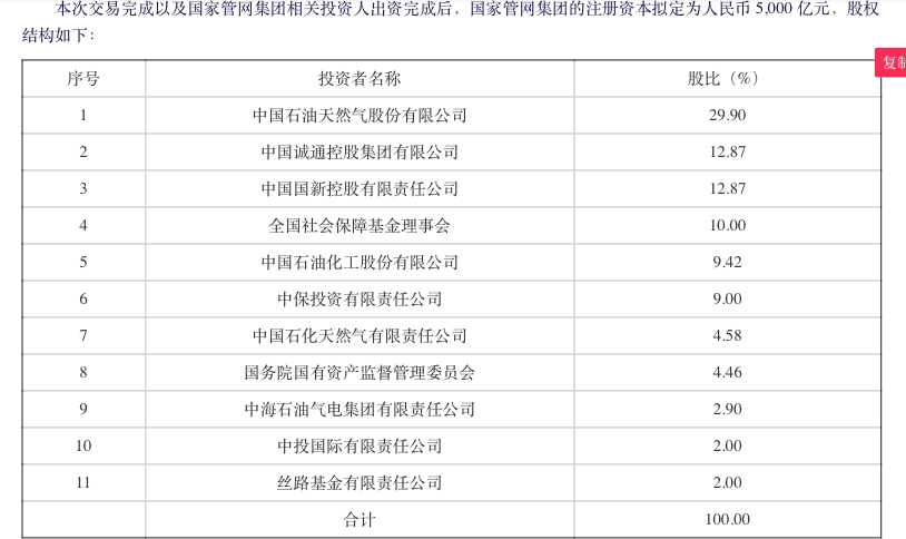 记者注意到,在本次交易完成以及国家管网相关投资人出资完成后,国家管网的注册资本拟变更为5000亿元,其中,中国石油持股29.9%,中国石化方面将合计持14%股权。
