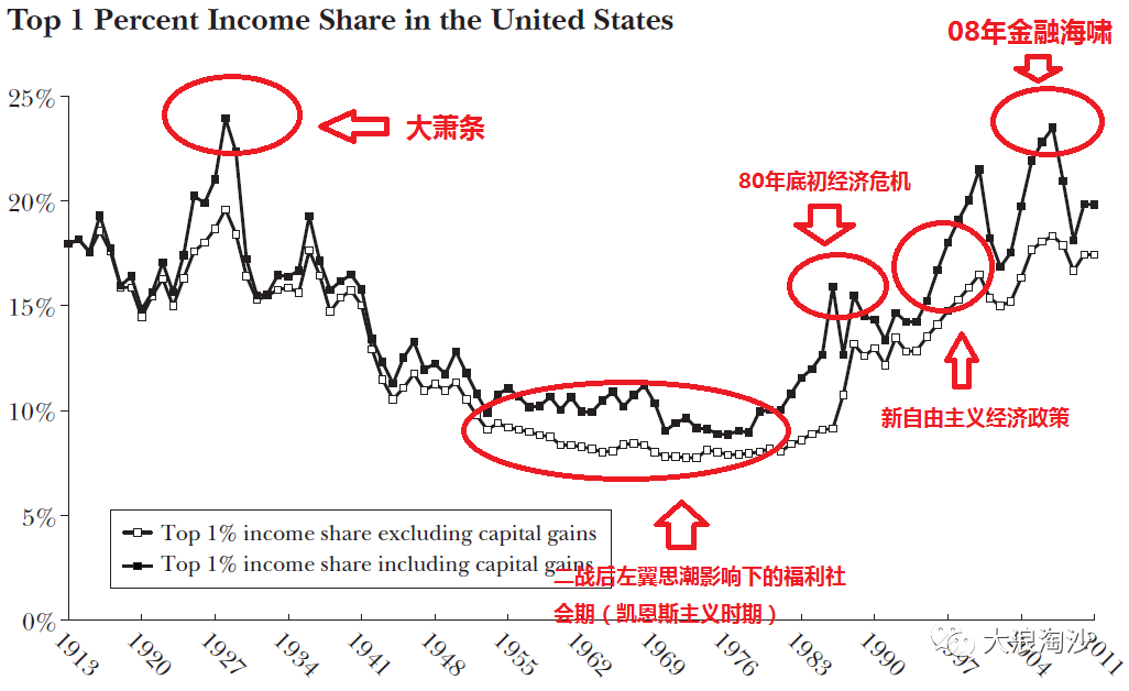 上图是美国top1%人群中的收入状况,可以看到在经济危机来临之前,都是美国贫富分化、财富集中最顶点之际,也就意味着生产过剩与需求不足达到了最大值。就像我之前的文章写过,封建王朝土地兼并到一定程度会引发农民起义,资本主义社会的财富集中到一定程度会诱发经济危机。