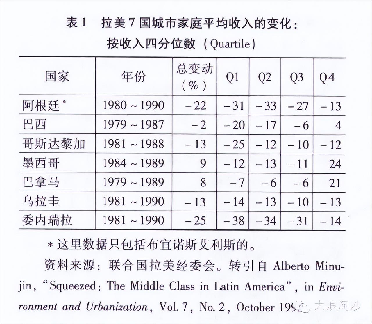 在这样的背景下,拉美国家出现了一个非常典型的社会现象——中产阶级贫困化,即出现了被人们称作的“新穷人”群体。阿根廷学者米奴金(Alberto Minujin)将那些能够继续拥有房产和资产、一定的教育水平却无法获得足够的收入而维持在贫困线上的中产阶级定义为“新穷人”。下表反映了拉丁美洲在经济衰退十年中不同群体的收入变动,米奴金根据联合国拉美经委会的数据,将拉美国家收入群体划分为四分位数(跟中位数是一个意思,这里是四等分了),可以宽泛的理解为Q1是最底层贫民,Q2、Q3是中产阶级和准中产阶级,Q4是最富裕阶层。