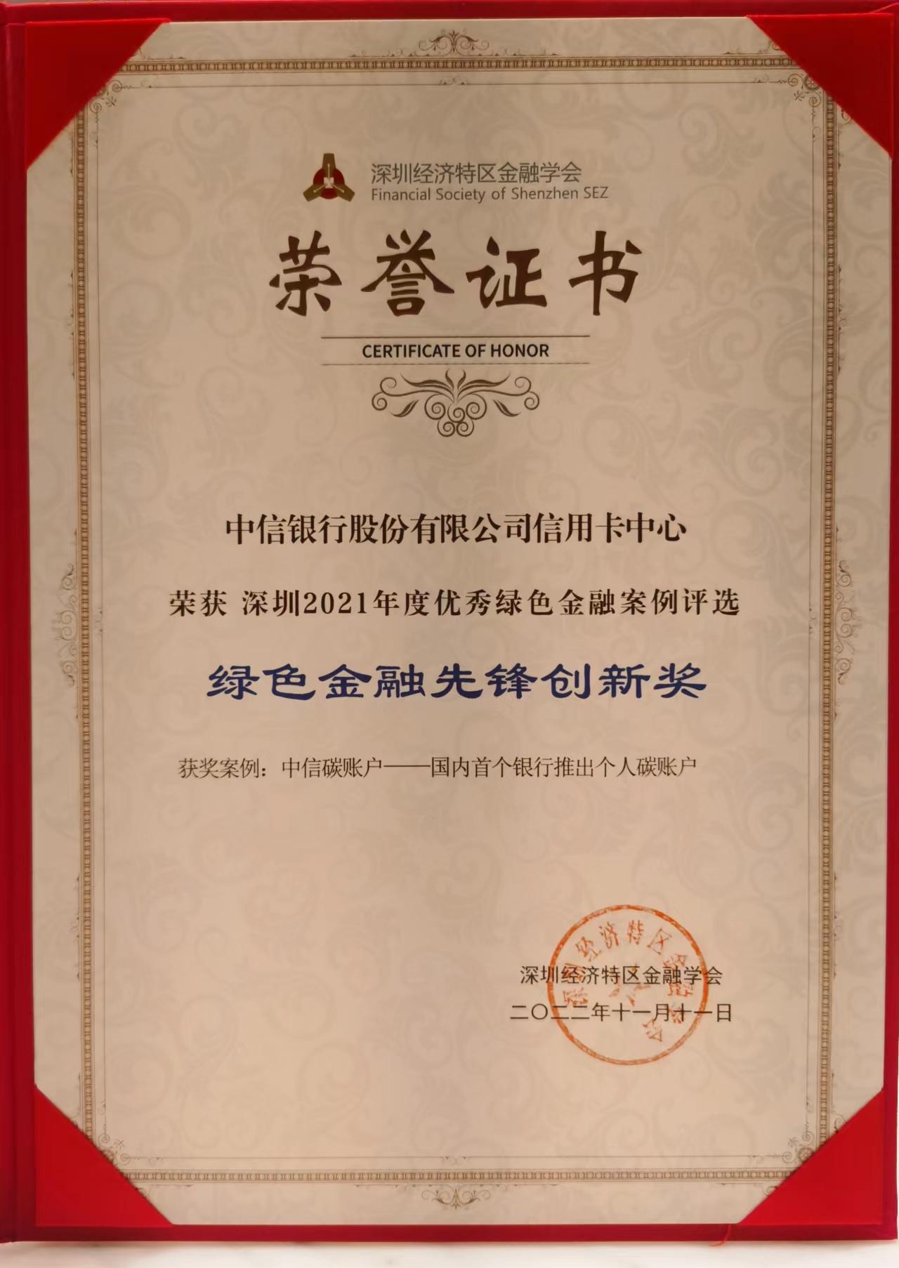 “中信碳账户”作为计量个人碳减排的“绿色账户”,从调研、开发到正式上线,得到了深圳市政府、深圳市金融局、深圳市银保监局的大力支持,与深圳市生态环境局、深圳绿金委、深圳排放权交易所开展深入合作,致力于共同打造绿色发展的深圳样板。本次获得“深圳2021年度优秀绿色金融案例——绿色金融先锋创新奖”,展现了“中信碳账户”在绿色金融创新方面的行业引领性和示范性。
