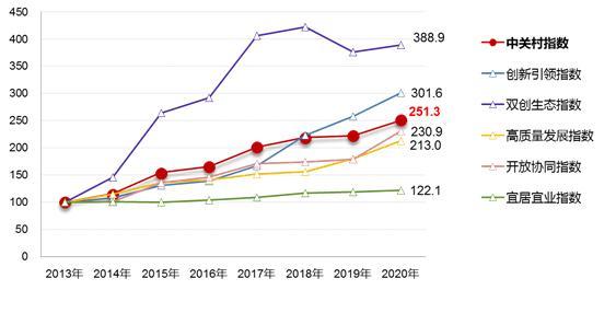 报告研究显示,中关村指数2020年达到251.3,较上年提升28.9。从五个一级指数来看,开放协同指数增长最快,较上年提升52.2,达到230.9;创新引领指数持续上升,较上年提高43.6,达到301.6;高质量发展指数增长较快,较上年提升32.8,达到213.0;双创生态指数较上年提升13.0,达到388.9;宜居宜业指数稳中有进,较上年提升3.0,达到122.1。
