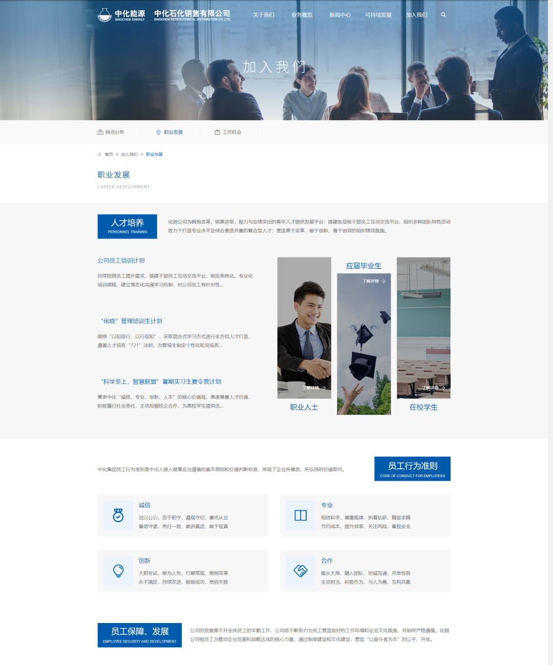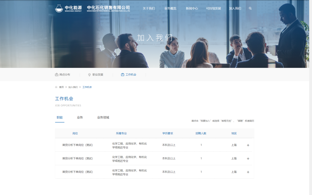 “加入我们”栏目展示了化销公司在人才培养、员工保障发展方面的理念、计划、措施,最新的岗位招聘信息也会第一时间在这里发布。