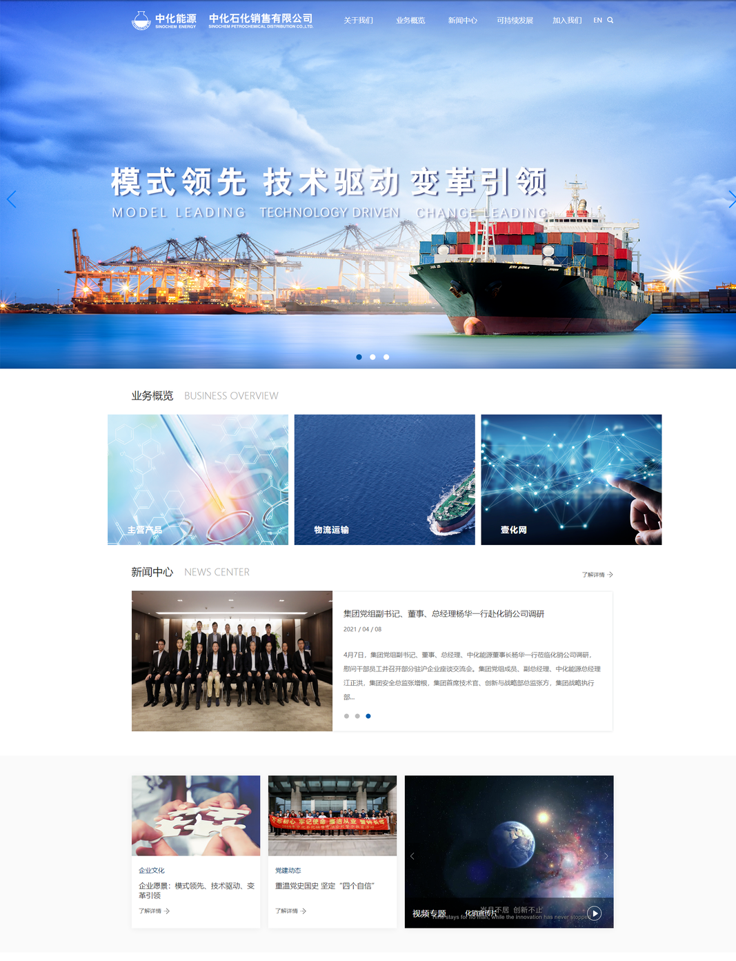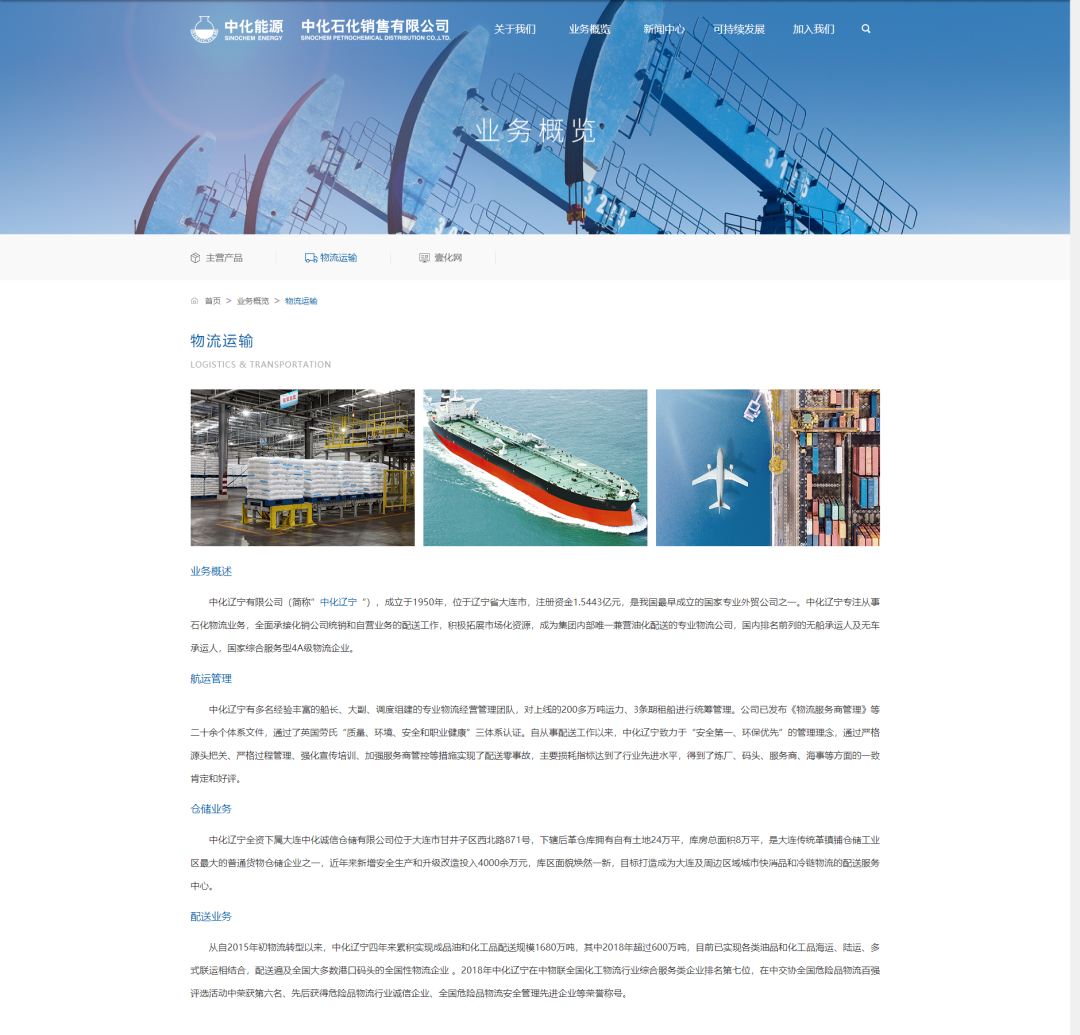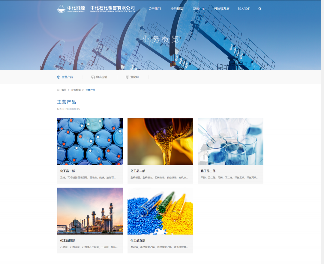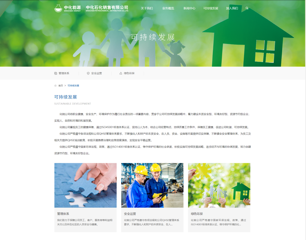 此次化销公司网站共设置5个导航栏目,涵盖关于我们、业务概览、新闻中心、可持续发展,