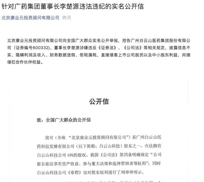 7月18日,北京康业元投资顾问有限公司发表一篇题为“针对广药集团董事长李楚源违法违纪的实名公开信”,控告白云山及其董事长李楚源涉嫌违反《证券法》、《公司法》等相关规定,披露信息不实、隐瞒利润及收入、财务数据造假、偷税漏税,直接侵害上市公司股民以及中小股东利益,间接侵犯合作伙伴权益。