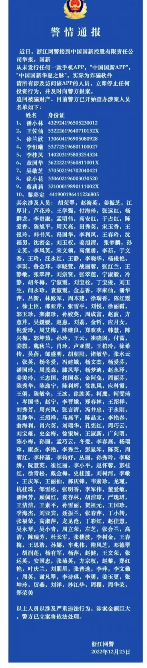 此外,浙江网警于2022年12月发布警情通报,指出“中国国新app”和“中国国新华夏之脉”为诈骗软件,涉案人员已被立案侦查。这是一起典型的套牌诈骗案件。