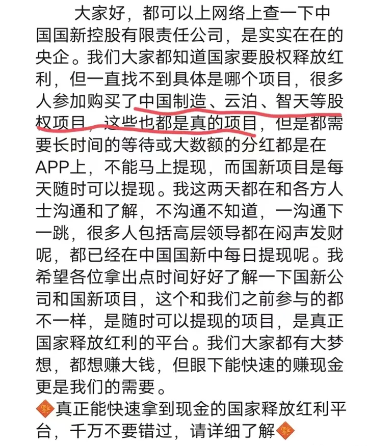 王女士表示,“中国国新华夏之脉app”上的项目声称是一个释放福报的国家项目,通过股权释放红利。