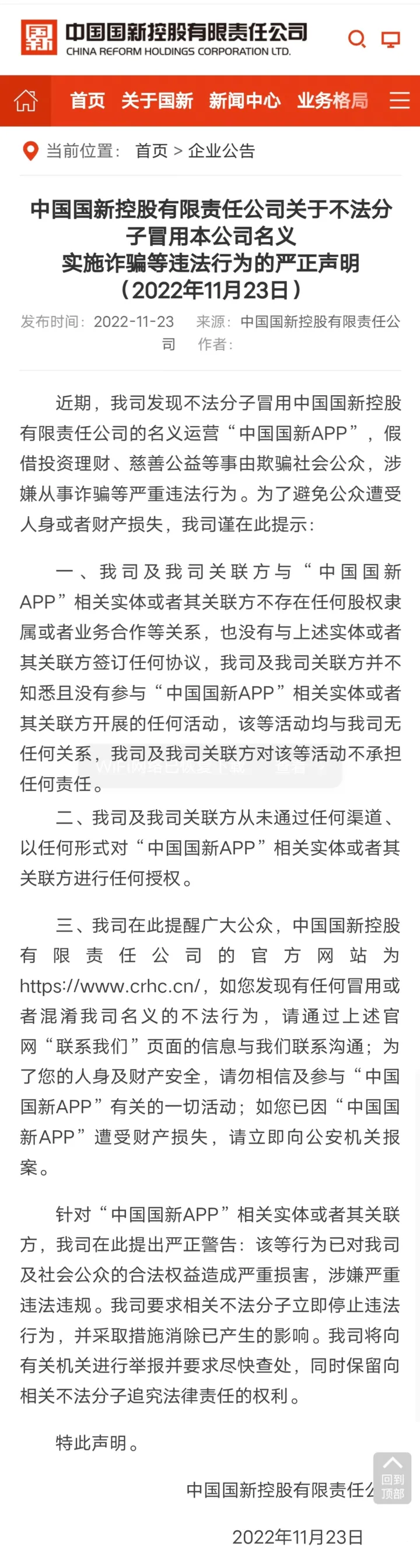 然而,经李旭反传防骗团队深入调查,2022年11月,“中国国新控股有限责任公司”官网发布企业公告,澄清“中国国新app”与公司无关,系不法分子冒用公司名义实施诈骗。