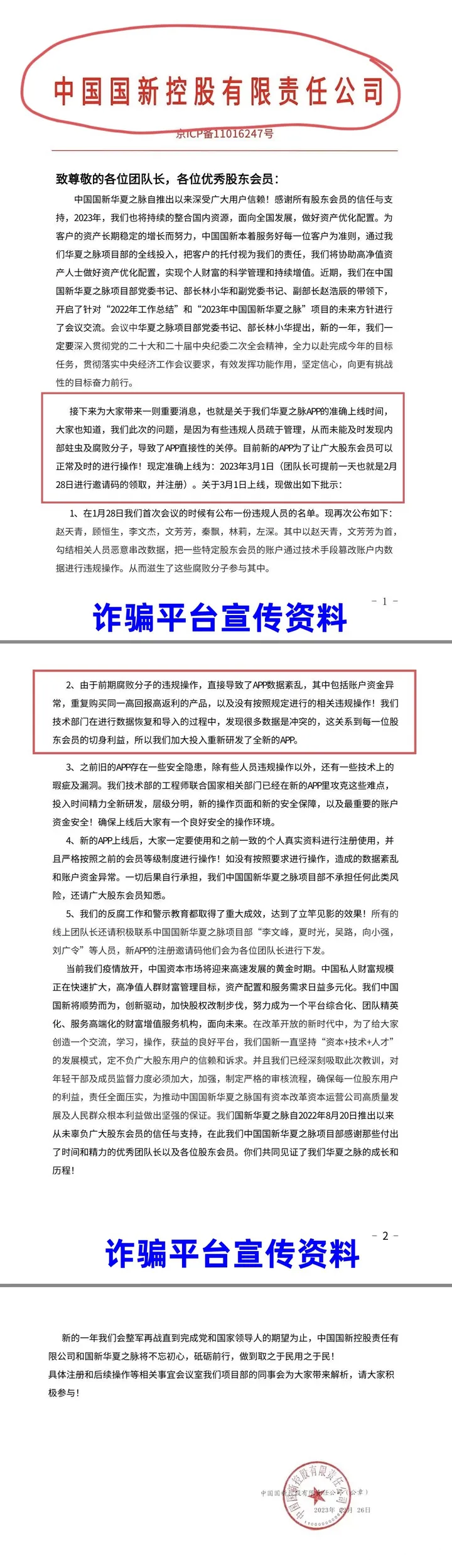 然而,张女士告诉李旭反传防骗团队,她的母亲仍然参与“中国国新”投资项目,不仅不听劝阻,还乐此不疲。2023年3月,“中国国新华夏之脉app”发布新公告,称旧版app关停原因为内部违规人员篡改数据导致资金异常,新版app于3月1日正式上线。公告标题和印章依然使用“中国国新控股有限责任公司”。