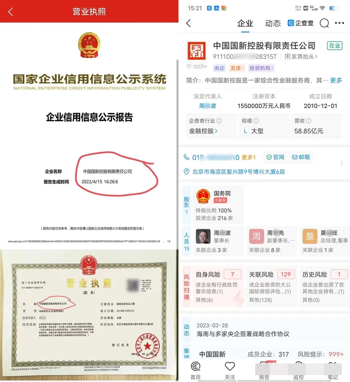 该平台展示的营业执照及相关合同的印章均为“中国国新控股有限责任公司”。经查询,该公司成立于2021年,确实是一家中央企业,受国务院资委监管。