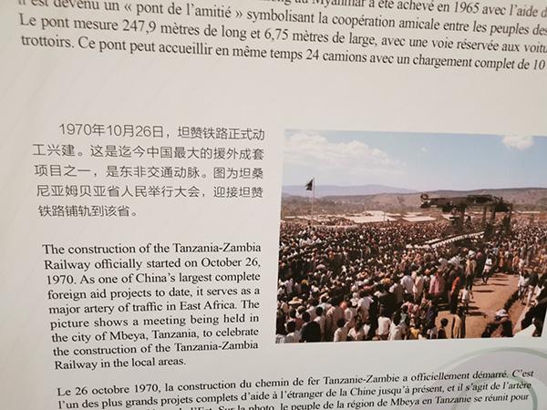 本次展览共分为加强基础设施建设、发展教育事业、紧急人道主义救援等9大篇章,展览内容分别用汉语、英语、法语等三种语言呈现。