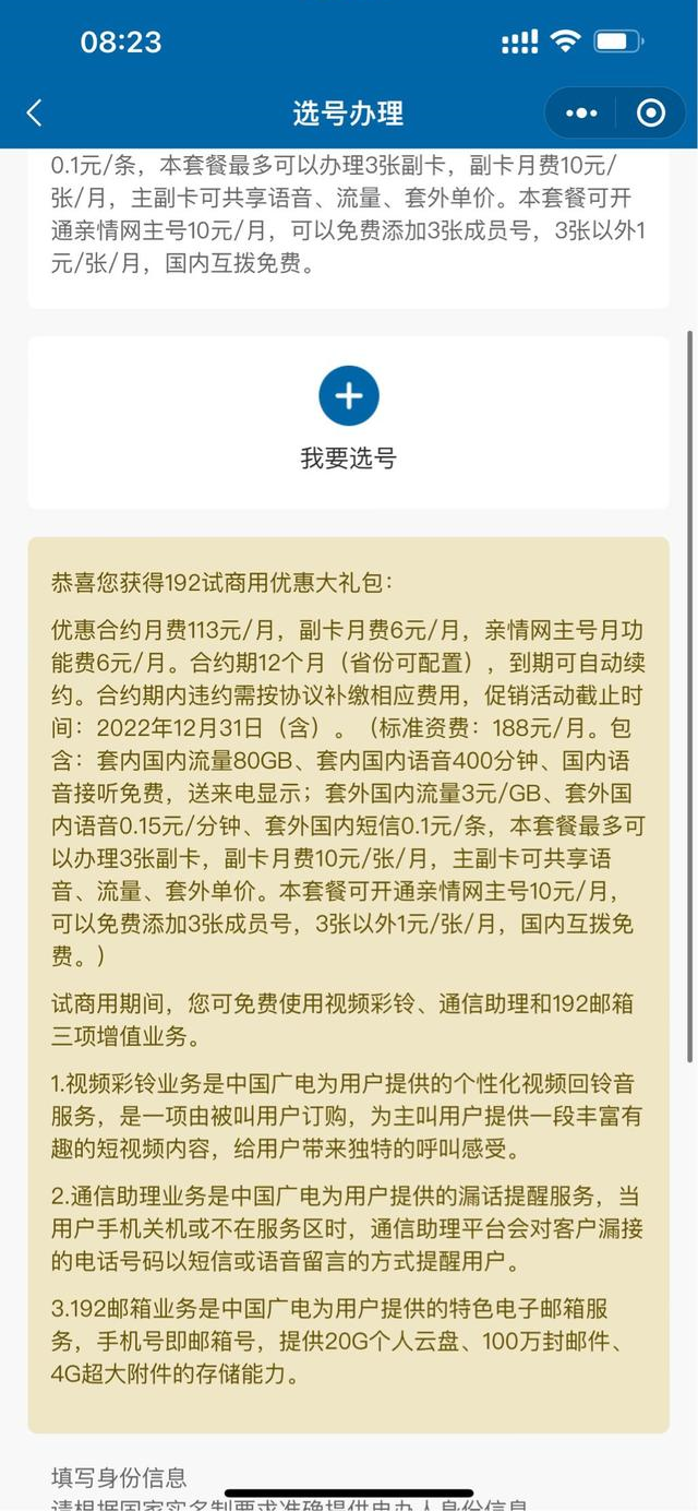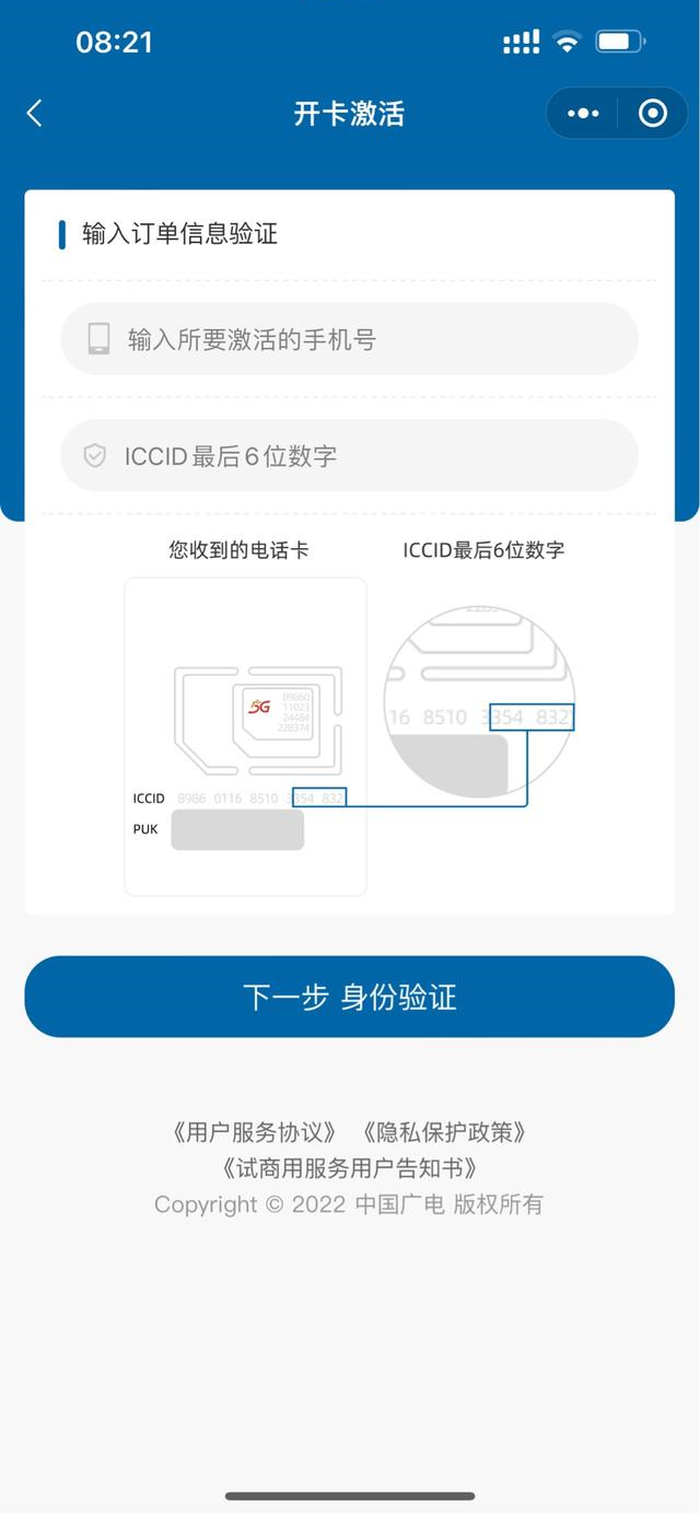 “中国广电营业厅”微信小程序主界面支持新用户号卡激活、视频彩铃办理、192 邮箱激活等,可进行靓号优选和办理 5G 套餐,用户开卡激活需要先拿到手机卡,输入手机号与 ICCID 最后 6 位数字。