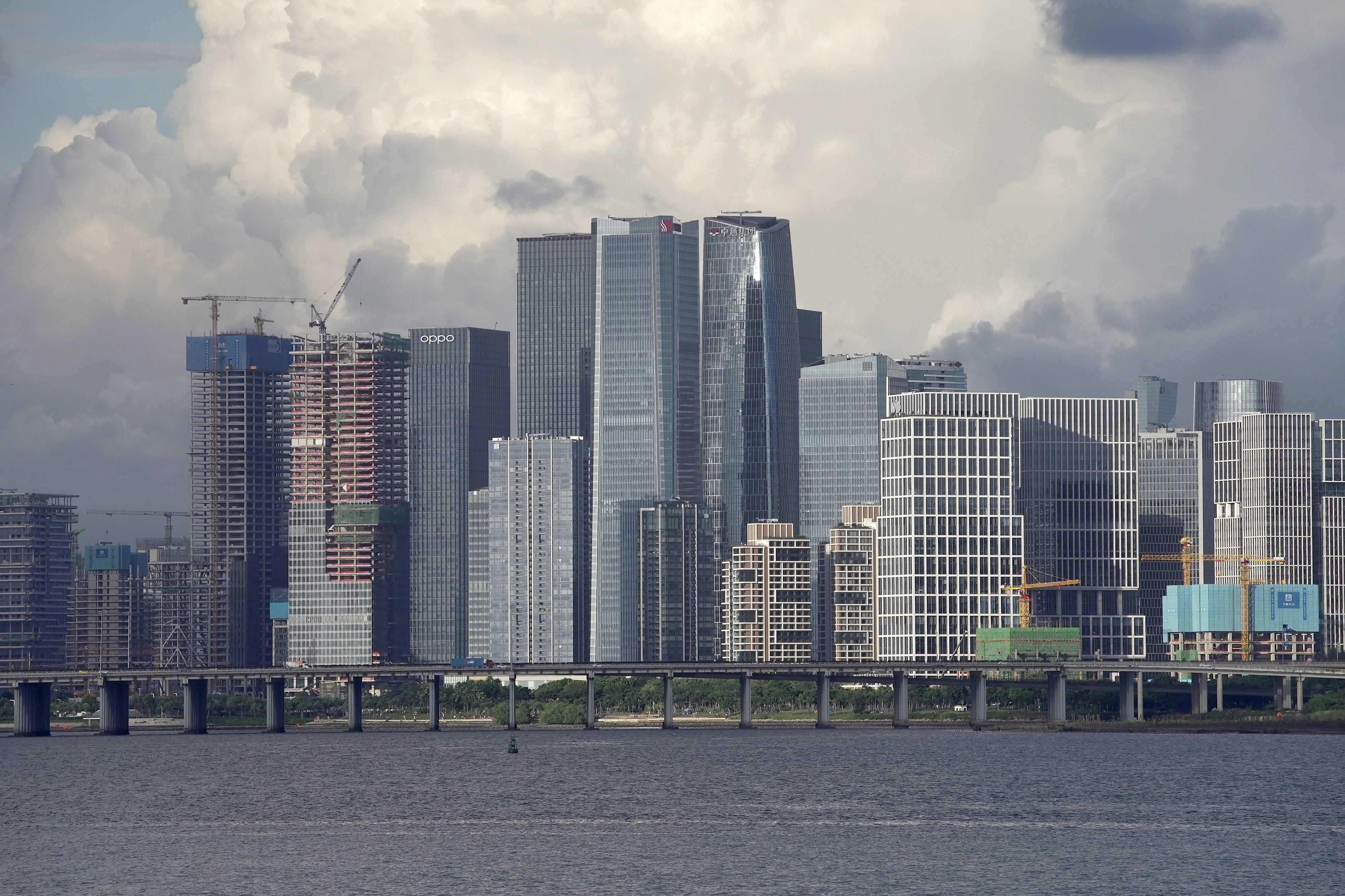 2022年8月,广东深圳,从海上眺望,前海自贸区已是高楼林立,广深沿江高速大桥横跨在前海湾上。图/IC photo