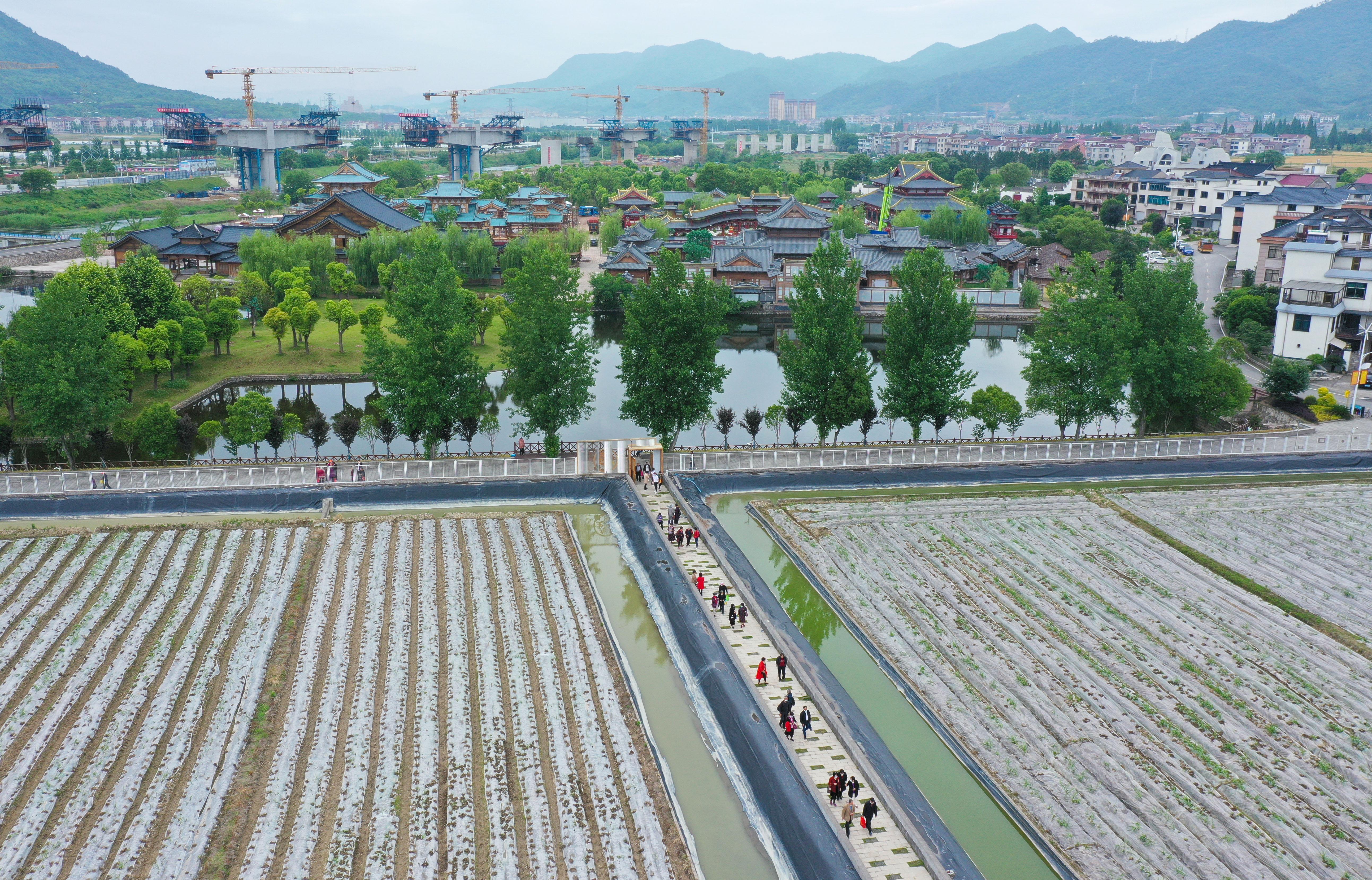 2022年5月10日,浙江东阳,从空中俯瞰湖溪镇八里湾村,绿油油的水稻等农作物与阡陌田园、秀美村庄相互映衬,呈现出一幅美丽的乡村振兴画卷。图/IC photo
