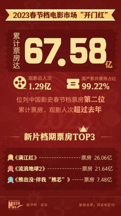 据国家电影局初步统计,2023年春节档(1月21日至27日)电影票房为67.58亿元,仅次于2021年春节档的78.42亿元,位居中国影史同期票房第二名。影院的春天回来了,电影行业的希望也回归了。