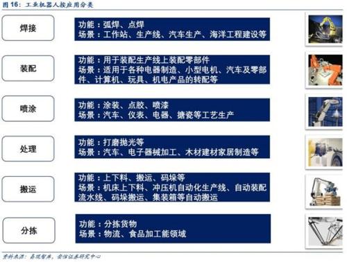 工业机器人是柔性自动化生产及系统集成的基础,而柔性自动化生产及系统集成则是工业机器人商业化应用的关键。系统集成方案解决商负责工业机器人软件系统开发和集成,为终端客户提供应用解决方案。系统集成商并非是标准化程序,而是定制化生产,因此系统集成商的竞争优势主要体现在定制化服务上,其中对客户需求的准确把握是关键。下游的应用包括焊接、装配、喷涂、处理和搬运等,系统集成商通过设定程序,将已经成型的机器人赋予相应的功能。