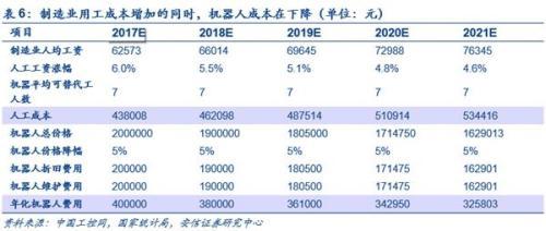 机器人技术的成熟体现在现有技术的运用成本降低以及高端技术的突破。对于现有工艺的熟练把握降低了机器人制造成本。在用工成本不断增加,机器人工艺成熟降低成本的的情况下,机器人的实用性将渐趋升高。我们对工业机器人对人工的替代性进行了测算(见表6)。根据中国工控网假设,一台大型焊接机器人,初始购置成本200万,三班倒计算可代替7个工人。根据日经中文网的调研数据显示工业机器人的平均使用期限是10年,我们假定每年的维护和折旧费用均为总费用的十分之一。根据Ofweek的数据显示,目前机器人的价格以每年的5%的速度下降。国家统计局统计的近几年制造业城镇单位就业人员工资情况表明工资增速放缓,2014年和2015年的增速分别为10.6%和7.7%,后续会进一步放缓。我们以边际递减速度放缓来估计之后几年的工资增长情况。从2017年开始,机器人使用成本既可以低于人工成本。