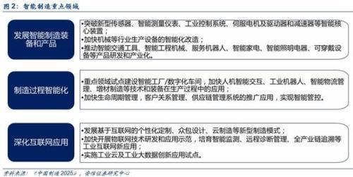 《中国制造2025》中着重发展的三大领域包括智能制造装备和产品、制造过程智能化和深化物联网应用,这三者在政策层面上虽是并驾齐驱,但本质上存在前后发展的关系。