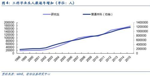 近年来我国工科毕业生数量呈现持续上升趋势,为机械工程师行业输送大量优质人才。在我国工程师薪酬远低于国外的基础上,叠加高水平工程师数量增加的优势,为我国工业机器人研发提供了高素质人才和低成本的双重优势。近年来,高校开设的机器人专业数量增加,同时相关领域领域的研究性人才也在不断向企业输出:1。机器人专业方面:教育部公布的《2016年度普通高等学校本科专业备案和审批结果》发现,有超过20家高校新增了“机器人工程”专业;2。以硕博士毕业论文为例,从2001年到2015年硕博士论文题目和关键词中带有“机器人”字样的博士生论文有2352篇,硕士生论文有18580篇。此外,在今年的6月28日,全国工业机器人职业岗位工程师培养项目正式启动,也意味着我国工业机器人领域的专业人才会进一步增加。