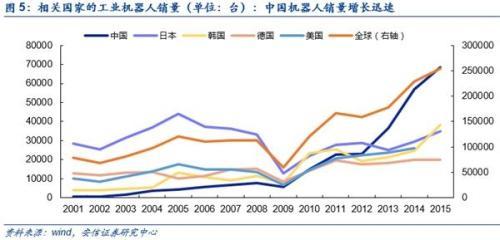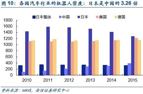 根据机器人规划,到2020年,中国自主研发工业机器人年产量达到10万台,密度达到150以上,根据2015年工业机器人密度为49,