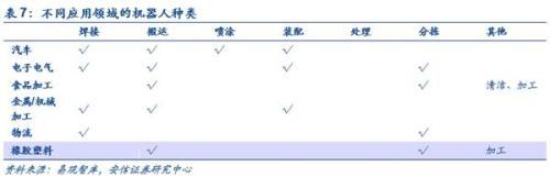 机器人下游的应用场景包括汽车、3C电子、食品加工、物流、橡胶塑料等。不同领域对机器人的功能需求不同,汽车、3C领域以焊接、搬运等为主,物流领域需要机器人完成分拣工作,食品加工领域还需要机器人具备清洁功能。