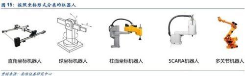 : 机器人的分类方式很多,按照机械结构分类可以分为串联机器人和并联机器人。按照程序输入方式可以分为编程输入型和示教输入型。按照坐标形式分类,可以将机器人分成直角坐标型、圆柱坐标型、球坐标型和关节型四类。按应用领域可分为焊接、装配、喷涂、处理和搬运五大类。工业机器人的产业链分为上游核心零部件,中游本体和传感器等生产,以及下游的系统集成等。