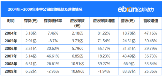财报显示,2004年到2009年,李宁销售额每年增长30%-50%,但应收账款增速更快,达到50%-80%。