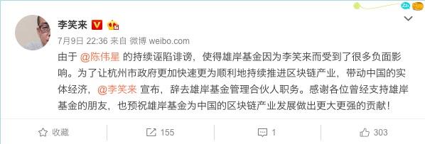 李笑来在微博中称,由于原快的公司创始人陈伟星的持续诬陷诽谤,使得雄岸基金因为自己而受到了很多负面影响,因而宣布,辞去雄岸基金管理合伙人职务。