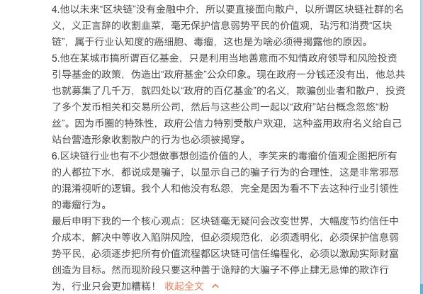 “他在某城市搞所谓百亿基金,只是利用当地善意而不知情政府领导和风险投资引导基金的政策,伪造出‘政府基金’公众印象。现在政府一分钱还没有出,他总共也就募集了几千万,就四处以‘政府的百亿基金’的名义,欺骗创业者和散户,投资了多个发币相关和交易所公司,然后与这些公司一起以‘政府’站台概念忽悠‘粉丝’。因为币圈的特殊性,政府公信力特别受散户欢迎,这种盗用政府名义给自己站台营造形象收割散户的行为也必须被揭穿。”