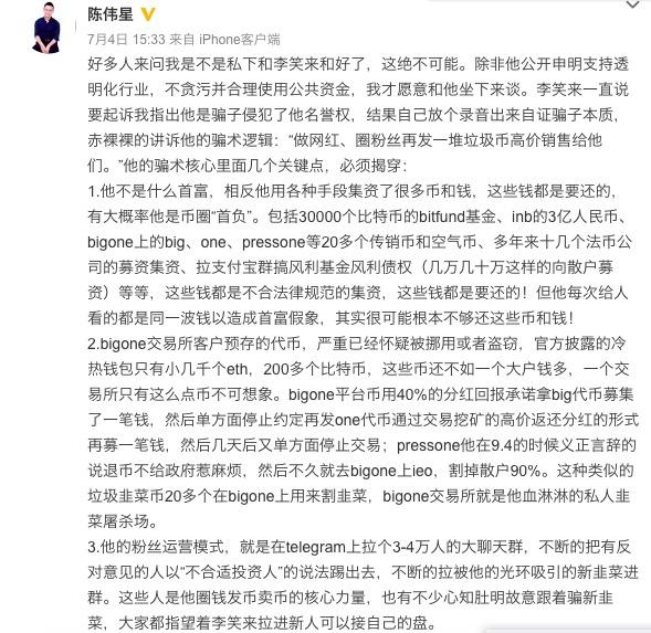 当天,陈伟星在微博发了一篇长文,称“李笑来一直说要起诉我指出他是骗子侵犯了他名誉权,结果自己放个录音出来自证骗子本质,赤裸裸的讲诉他的骗术逻辑:“做网红、圈粉丝再发一堆垃圾币高价销售给他们。”