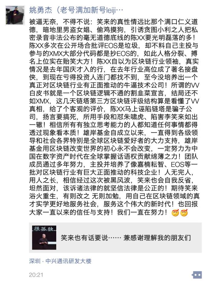 李笑来加入雄岸基金后,引来了颇多非议,而陈伟星的这番评论更让人陡生疑惑。对此,李笑来的合伙人姚勇杰在微信朋友圈表示,陈伟星是“人格分裂,贻笑大方”,并称“雄岸基金用区块链改变世界的初心没有变。”