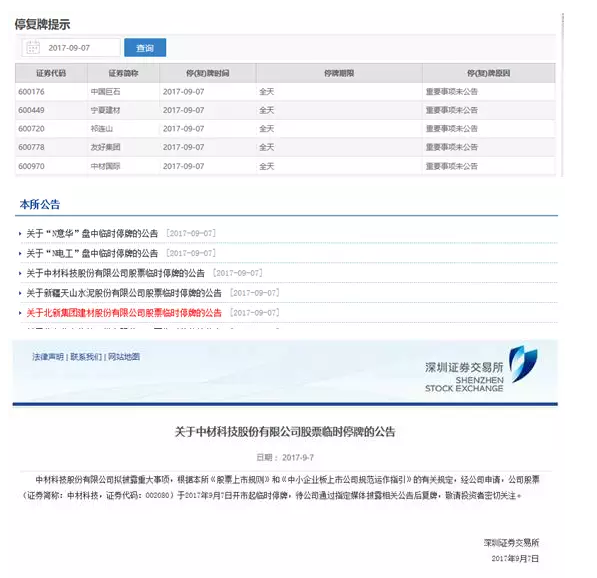 中国中材股份有限公司下的中材国际、宁夏建材、祁连山在上交所停牌,原因是因重要事项未公告;北新建材、天山股份、中材科技在深交所停牌,拟披露重大事项;中材股份在香港停牌,等待根据香港收购及合并守则刊发内幕消息。