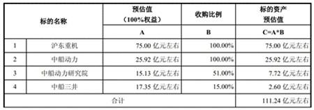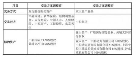 新方案中拟置入中船防务的标的资产为沪东重机有限公司100%股权,中船动力有限公司100%股权、中船动力研究院有限公司51% 股权、上海中船三井造船柴油机有限公司15%股权;拟置出资产为中船防务持有的广船国际和黄埔文冲的部分股权。