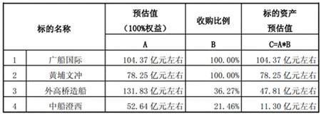 公告显示,由于特定投资者及其对江南造船的增资金额尚未完全确定,因此本次交易涉及江南造船的交易对方及预估对价暂未确定。其他重组标的资产中广船国际100%股权、黄埔文冲100%股权、外高桥造船36.27%股权和中船澄西21.46股权预估值分别为104.34亿元、78.75亿元、47.81亿元和11.3亿元。