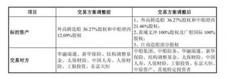 早在2018年年初,中国船舶也通过相关收购协议,拟发行股份从华融瑞通、新华保险等交易方手中购买上海外高桥造船有限公司36.27%股权和中船澄西船舶修造有限公司12.09%股权。而此次新方案进行了调整:发行股份从华融瑞通、新华保险等交易对方手中购买外高桥造船27%股权和中船澄西21.46%股权,交易完成,外高桥造船和中船澄西将成为中国船舶全资子公司。