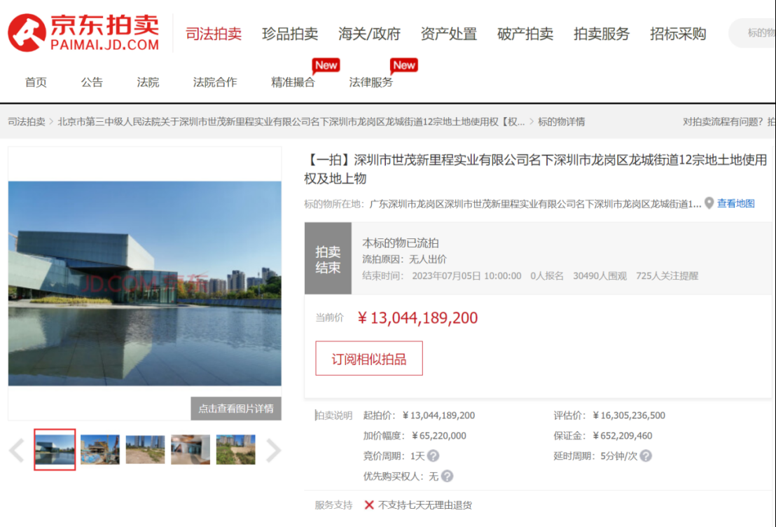 7月5日,曾被规划为“中国第一高楼”的世茂深港国际中心项目部分用地因无人出价而流拍了。一个月前的5月31日,深圳市世茂新里程实业有限公司名下深圳市龙岗区龙城街道12宗地土地使用权及地上物挂牌京东法拍,这是世茂深港国际中心的大部分资产。该资产起拍价约130.44亿元,评估价约163.05亿元,法拍将于7月4日开拍。