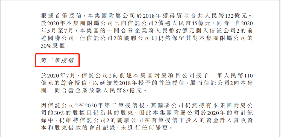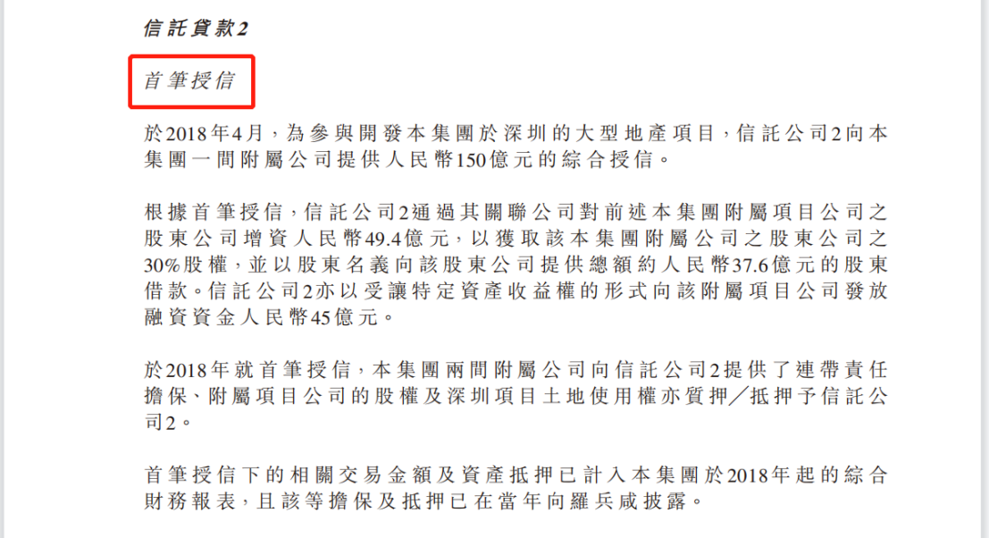 信息显示,2018年4月,为参与开发世茂集团于深圳的大型地产项目,信托公司向前者一附属公司提供了150亿元的综合授信。