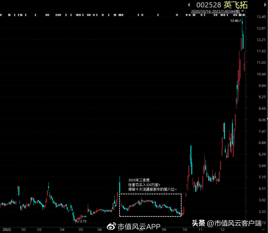 巧合的是,张素芬的建仓时机非常精准,2022年三季度建仓完成后,英飞拓股价从10月12日至20日连续7个涨停;在经历4周调整后,该股再次上涨,并在2023年1月4日创下自2016年以来的历史新高。
