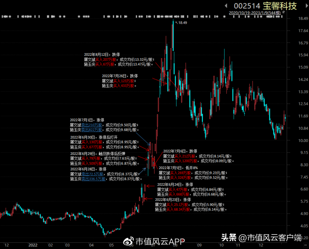 风云君在《一壳养三代,坐庄富一生!私募潜伏、牛散举牌、游资唱戏,宝馨科技:摊子虽烂,庄股上品》提到,屠文斌、施玉庆夫妇高抛低吸赚差价,并于2022年7月7日披露,合计持股2771万股,占当时总股本的5%,构成举牌,成为宝馨科技大股东。
