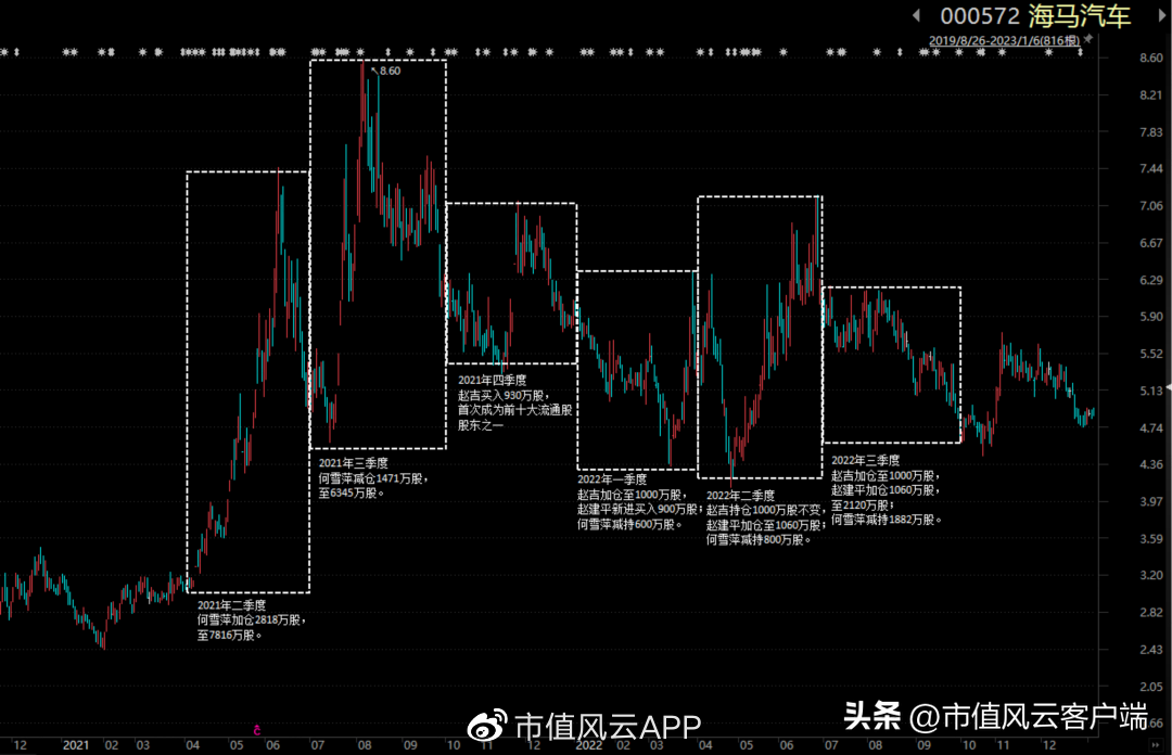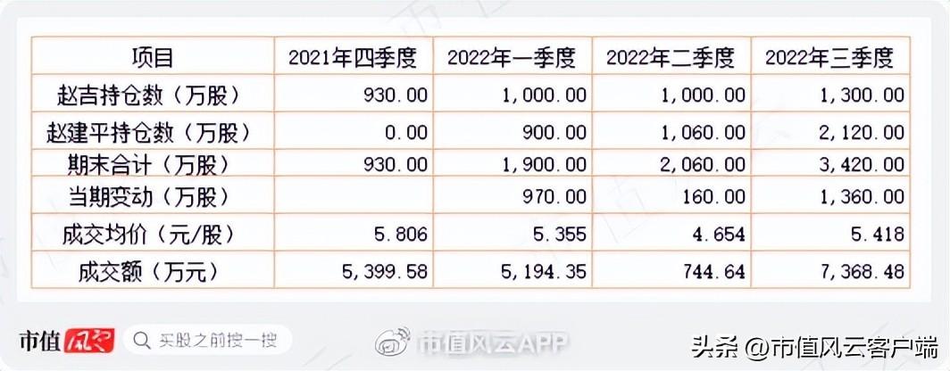 2021年四季度,赵吉建仓海马汽车930万股并继续加仓;而后赵建平一路加仓,至2022年三季度末,持仓2120万股,与赵吉的持仓合计3420万股。