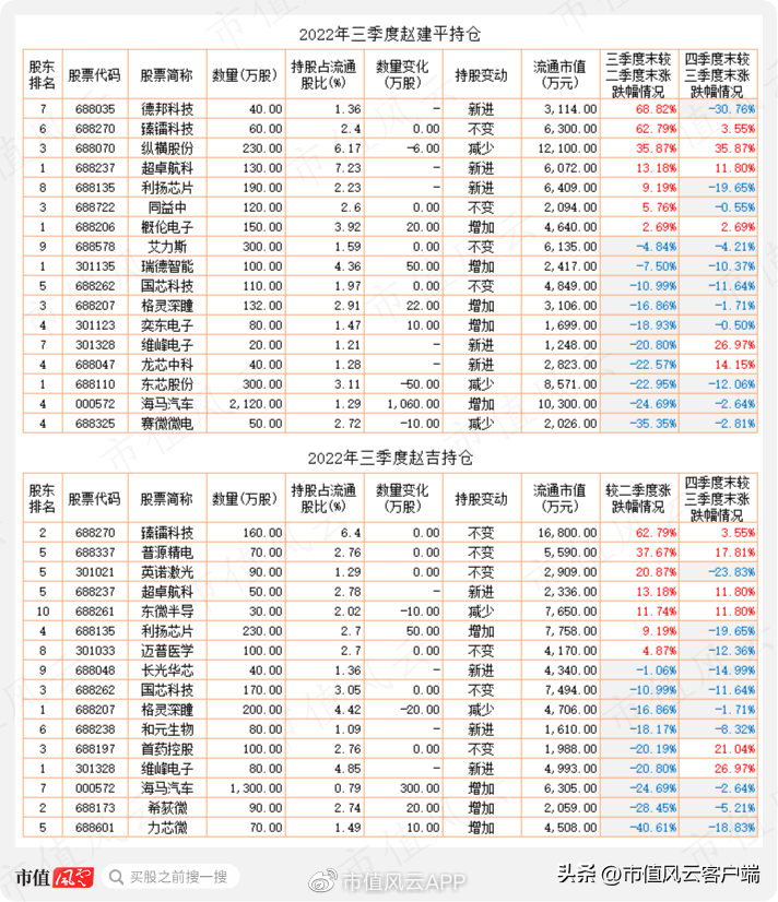 从股价表现看,截止2022年三季度末,赵建平、赵吉两人的持仓超过半数的个股均没有较好表现,甚至还出现较大幅度下跌;而四季度整个市场继续调整,绝大部分个股出现下跌。