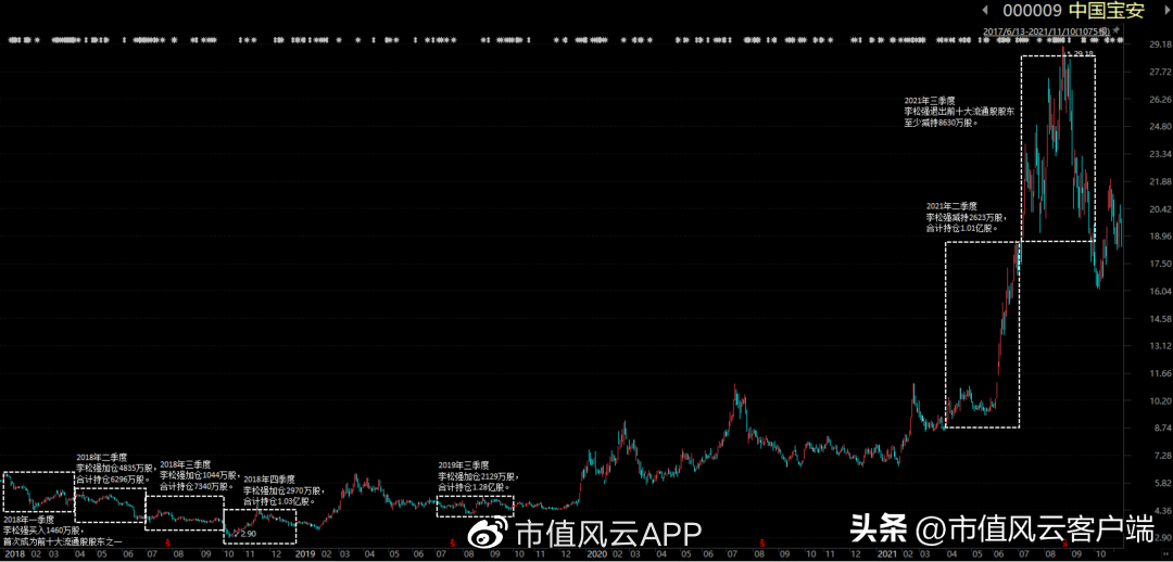 李松强在中国宝安上的操作非常简单,买入后长期持有,直到高位卖出兑现。