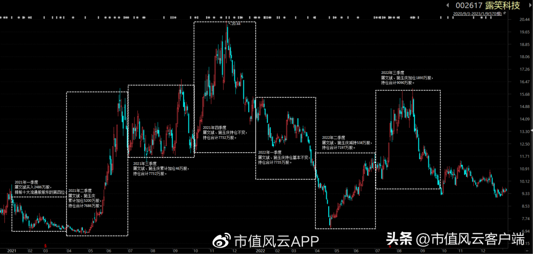 两人先后于2021年一、二季度现身露笑科技(002617)的前十大流通股股东列表,后者的股价在2021年5月至6月、10月至11月出现两轮上涨,两轮轮涨幅分别超过110%、50%,从季度期末持仓数据看,这两轮大涨中,两人均没有减持,坐了过山车。